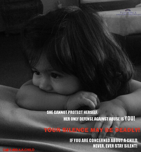 The latter is not meant to discourage you from contacting Child Protective Services. On the contrary, we encourage you to ALWAYS call and report the abuse/suspected abuse to CPS; however, if the child is in immediate danger, CALL 911! Remember, if you see that no one has followed up on the call and visited the home, KEEP CALLING AND REPORTING until someone does show up!
